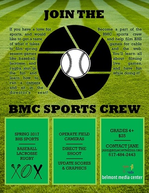 If you have a love for sports, and would like to get a taste of what it takes to film spring season games like baseball, lacrosse, and rugby, join in the fun and learn how to run a camera and sit in the director's seat! Become a part of the BMC sports crew and help film BHS games for cable and the web. You'll learn all about filming live games, and have fun while doing it!