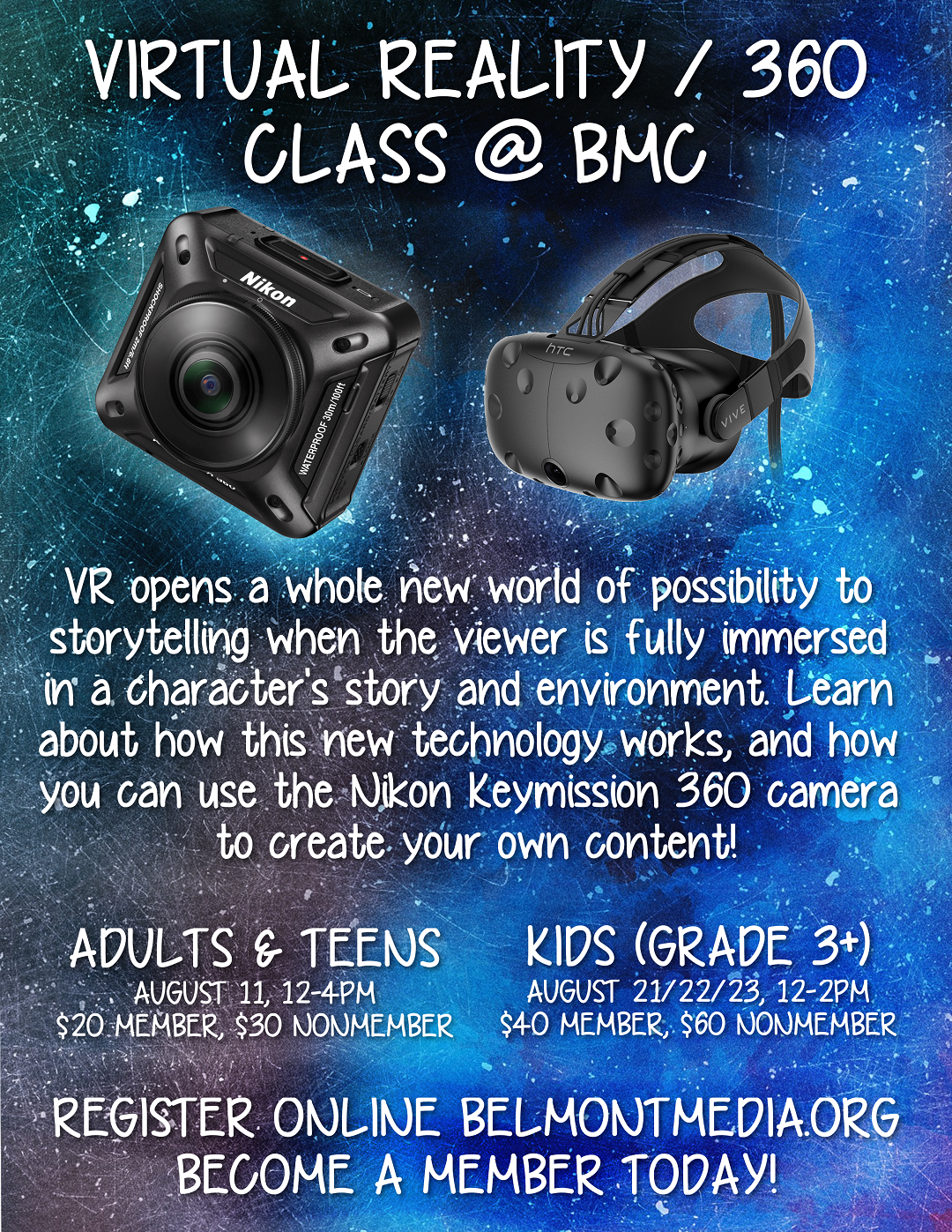 Curious as to what Virtual Reality really is? What's the point, and can you really create VR content? Learn about Virtual Reality with BMC's HTC Vive, and experience it for yourself! Participants will learn about how VR content is created, and how it differs from tradtitional media. Then, learn how to use the Nikon KeyMission, a 360º camera, to shoot high-quality 360 video, and how to edit and upload to YouTube! Participants will get hands-on learning with this new and exciting technology.